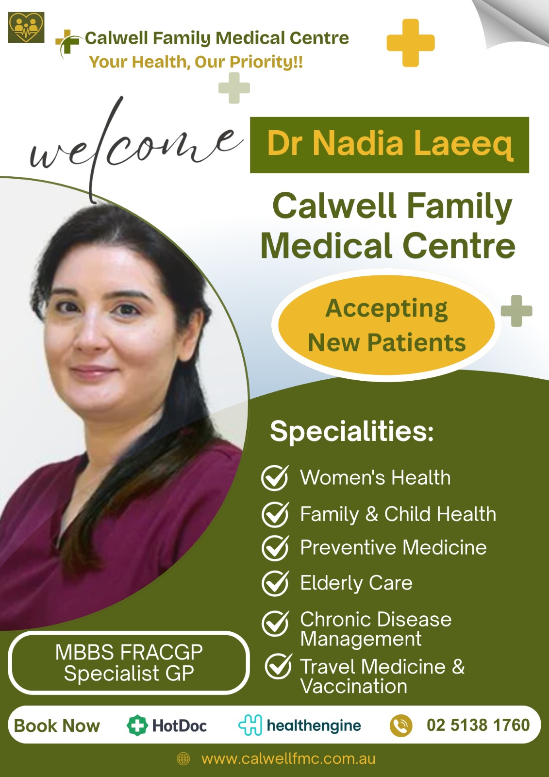 We are actively working to bring a range of visiting specialists to Calwell Family Medical Centre to provide more comprehensive care locally.
